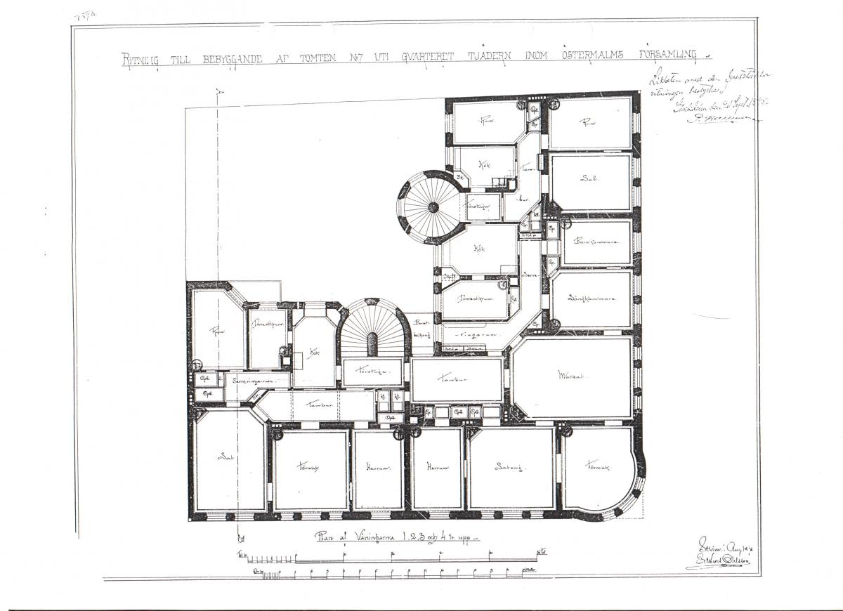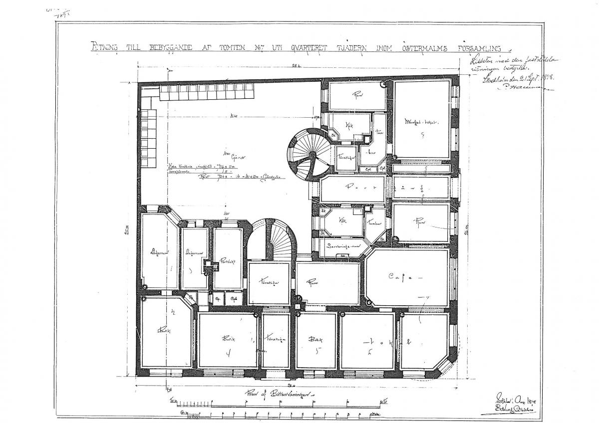 " Vid verkställd kontrollutstakning af ett under arbete varande boningshus af sten, som direktör Gustaf Palmqvist genom byggnadsnämndens resolution af den 21 september innevarande år (1898) erhållit tillstånd att uppföra å tomten Nr:7, efter 1810 års nummerordning, uti qvarteret Tjädern, inom Ladugårdslands församling, har befunnits, att detsamma, som är beläget i hörnet af Sibyllegatan och Tyskbagargatan samt upptager tomtens hela utsträckning mot dessa gator med undantag af det till 2 meter 50 centimeter afskurna hörnet, är anlagdt i rätta gatulinjerna samt å östra sidan med en bredd af 12 meter 3 centimeter i rätta gränslinjen mot tomten Nr: 6 och å norra sidan med en bredd af 14 meter 76 centimeter i rätta gränslinjen mot tomten Nr: 8, äfvensom att byggnaden är uppförd i hufudsaklig öferensstämmelse med den af byggnadsnämnden fastställda bottenplanritningen, det varder härmed till bevis meddeladt. Stockholms stadsingenjörskontor den 20 december 1898, undertecknat enligt uppdrag av Alfred Betzer".