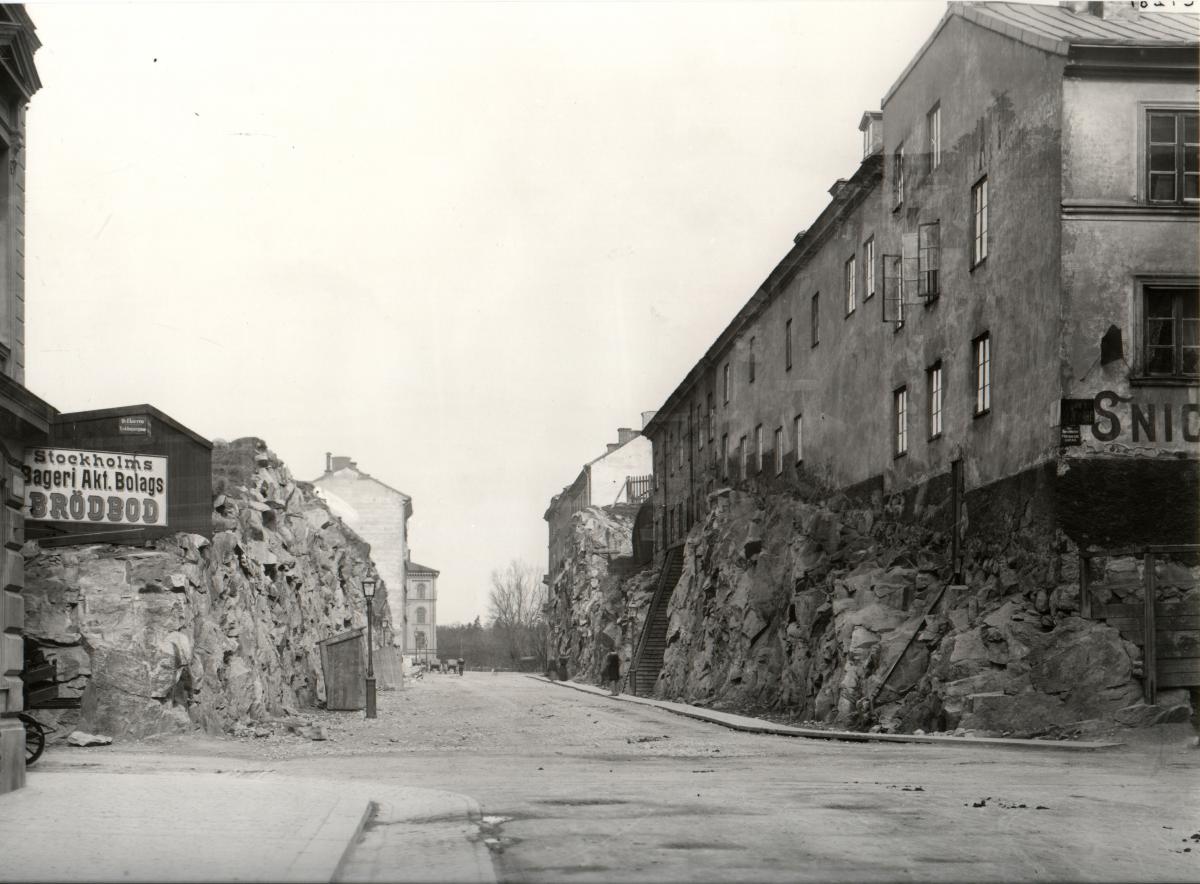 Foto taget från korsningen Sibyllegatan/Tyskbagargatan år 1894. Bilden visar den fastighet som revs för att ge plats för vårt hus. Sibyllegatan är här mycket smalare samt omgiven av Tyskbagarbergen.