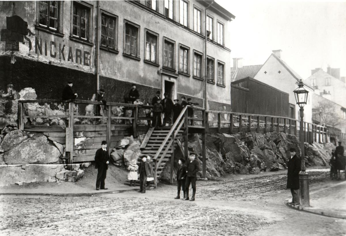 Tyskbagargatan 7 f.d. Ladugårdslands Tullgata nr 14. Fotot taget i hörnan Sibyllegatan/Tyskbagargatan år 1895.