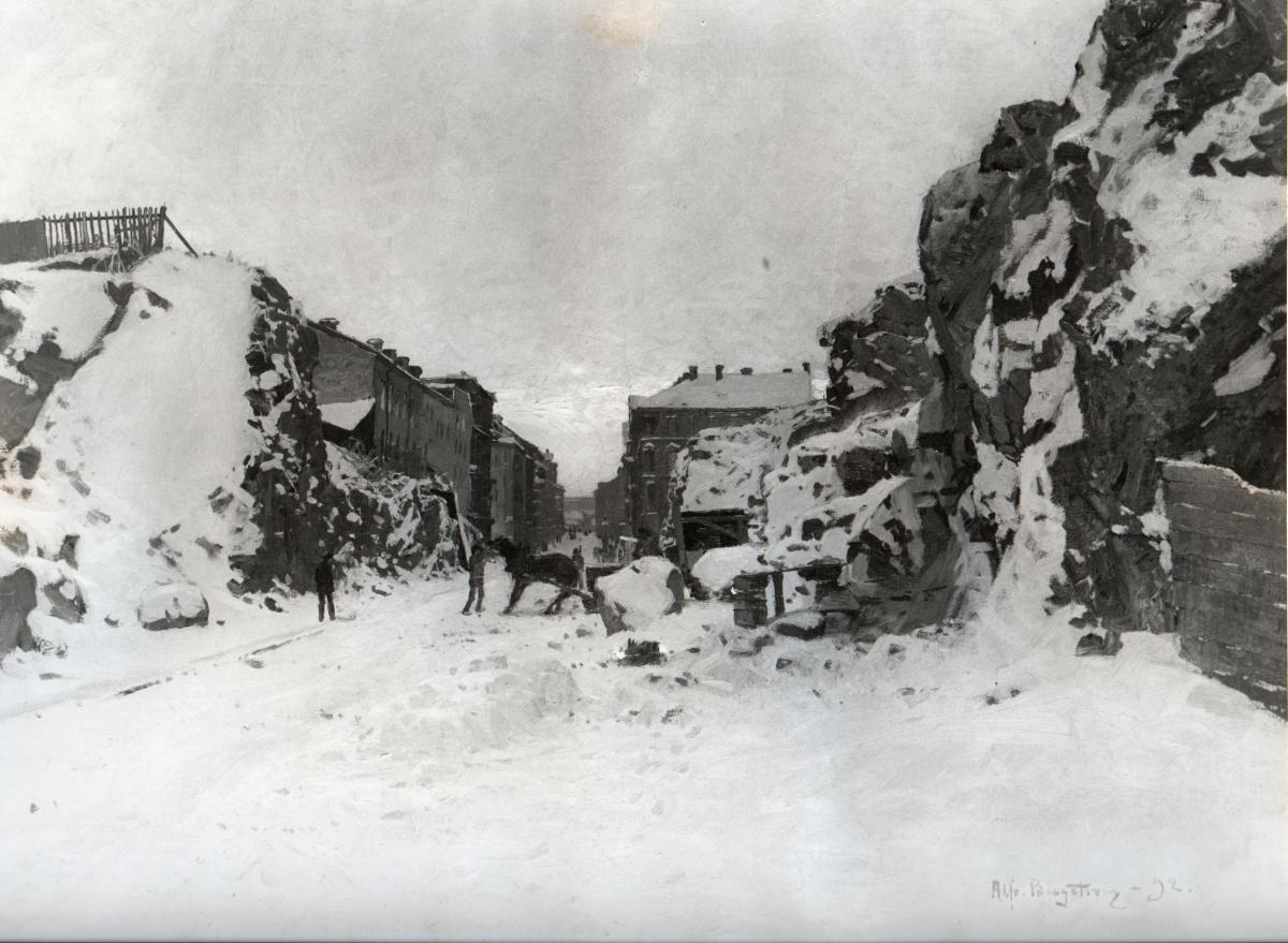 Sibyllegatan söderut sedd från Valhallavägen. Oljemålning av Alfred Bergström 1892.