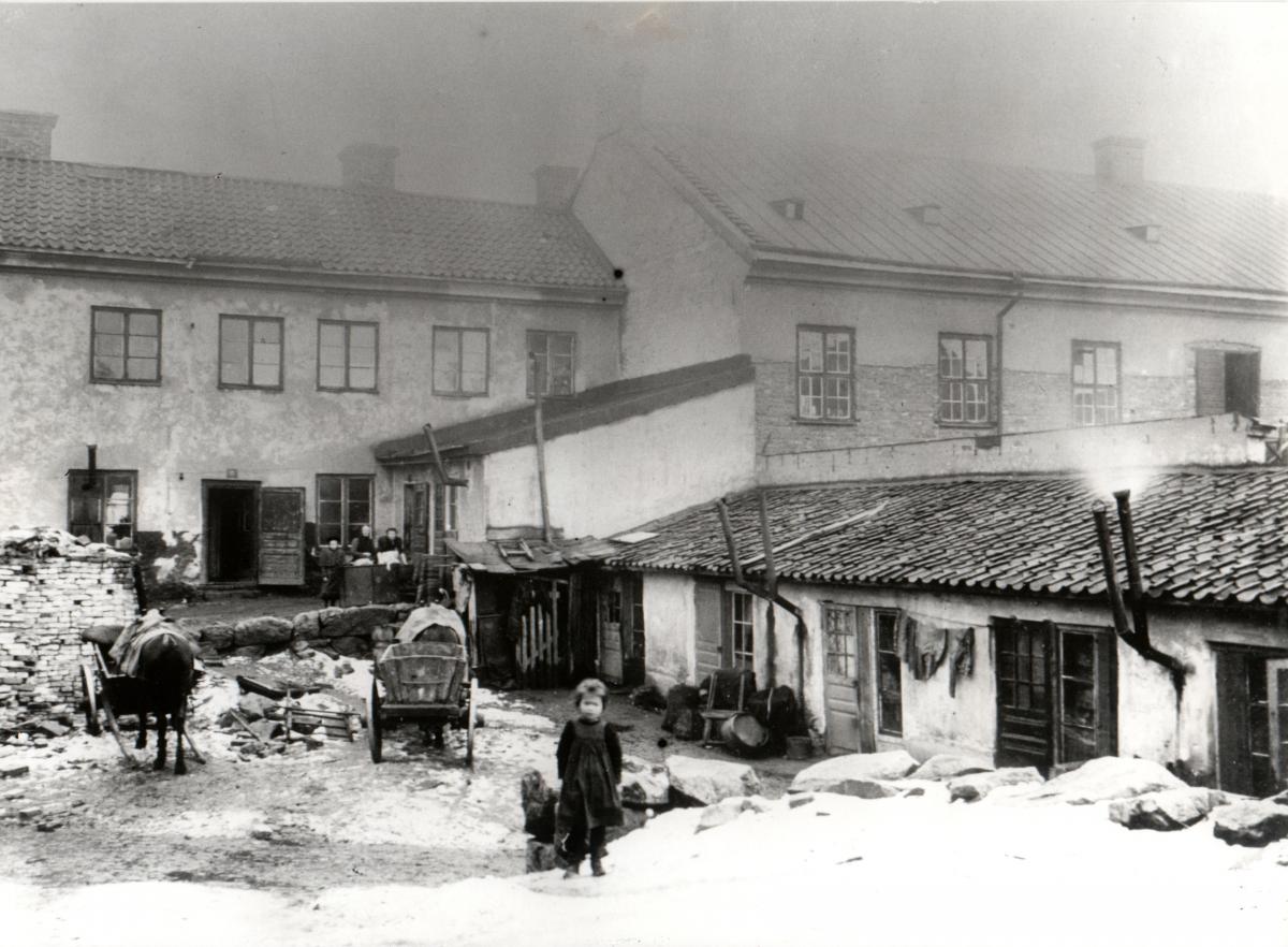 Gårdsinteriör från Sibyllegatan 40 taget från Jungfrugatshållet i oktober 1897. Det är alltså vår gård vi ser men den ligger betydligt högre upp än idag. Revs för att ge plats för vårt hus.